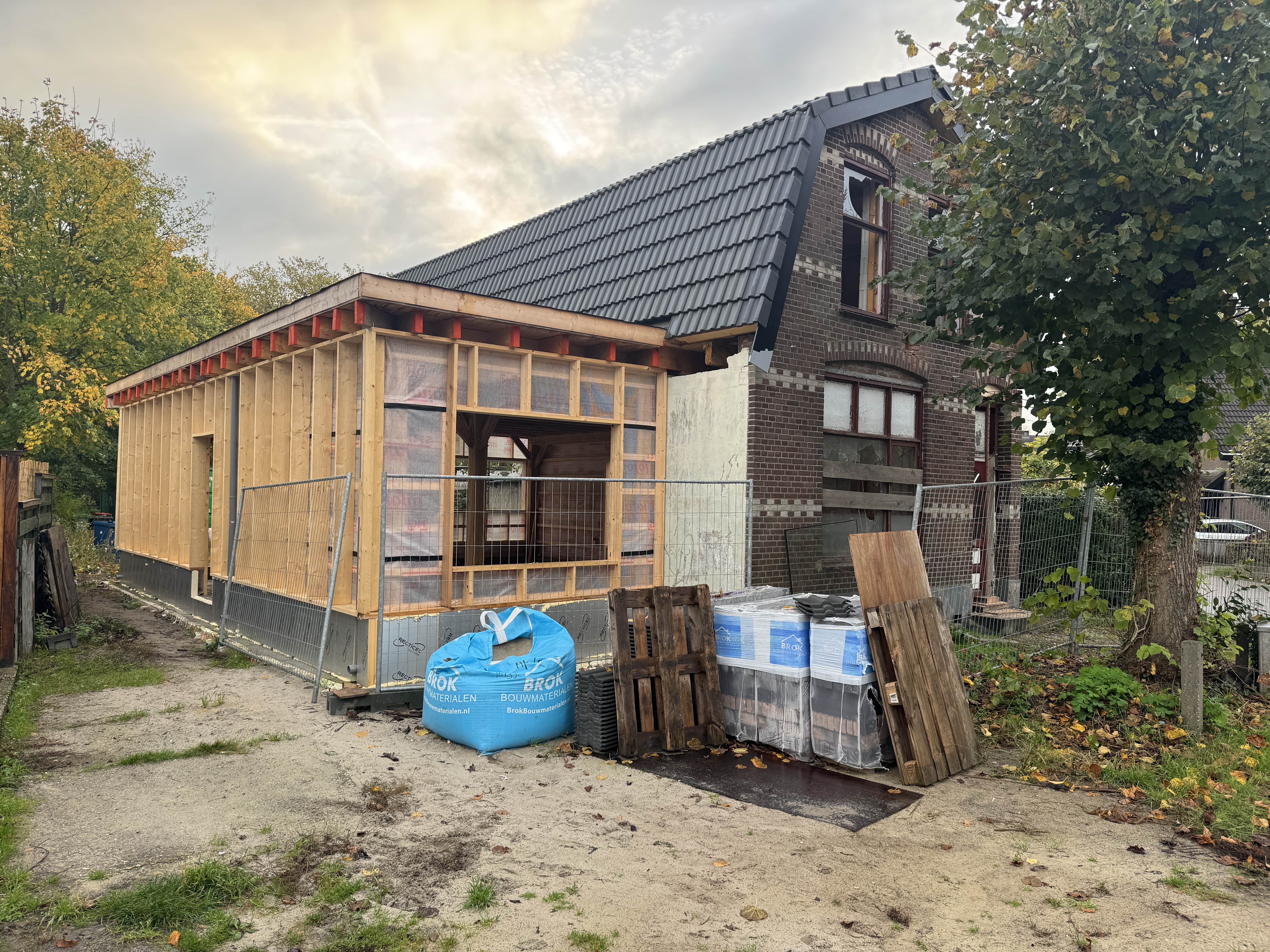 De oude kozijnen zijn verwijderd en de openingen staan klaar voor de nieuwe houten kozijnen, tuindeuren, draairamen en voordeur met bovenlicht.