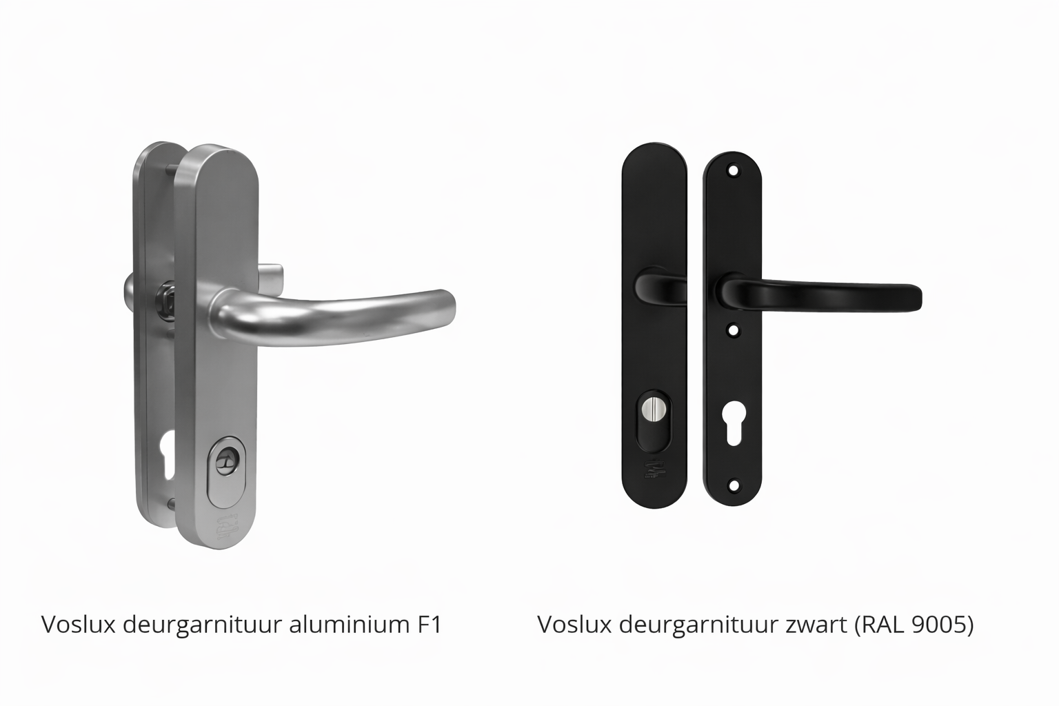 Het beslag wordt standaard meegeleverd in de kleur aluminium F1. Wanneer je kiest voor een houten deur heb je ook de keuze voor zwart beslag.