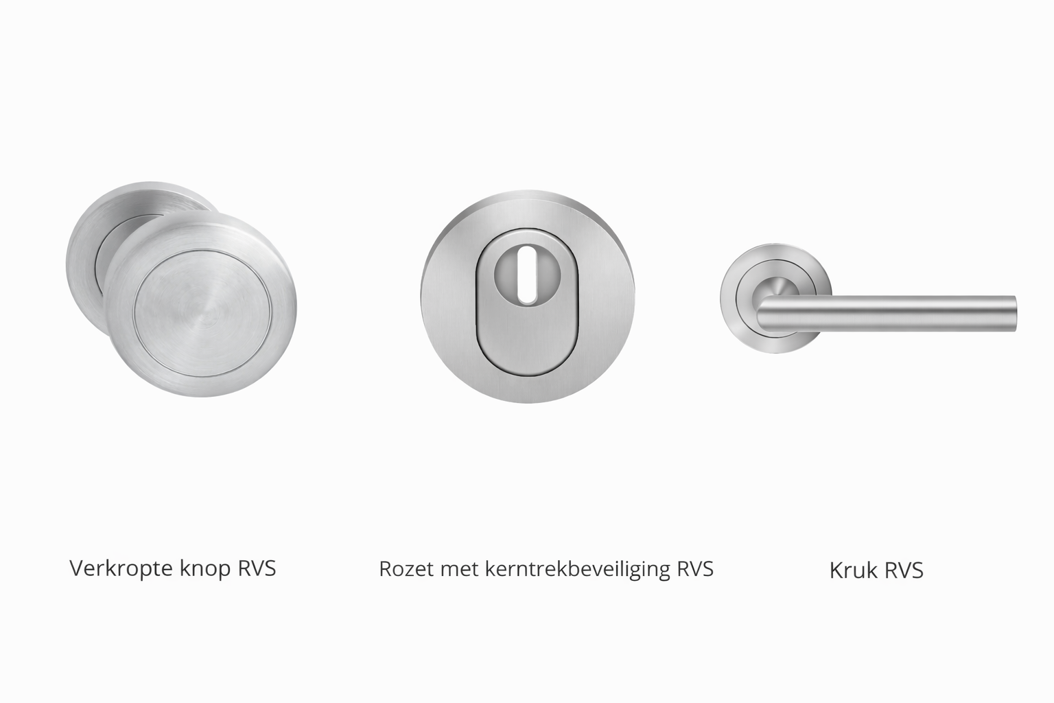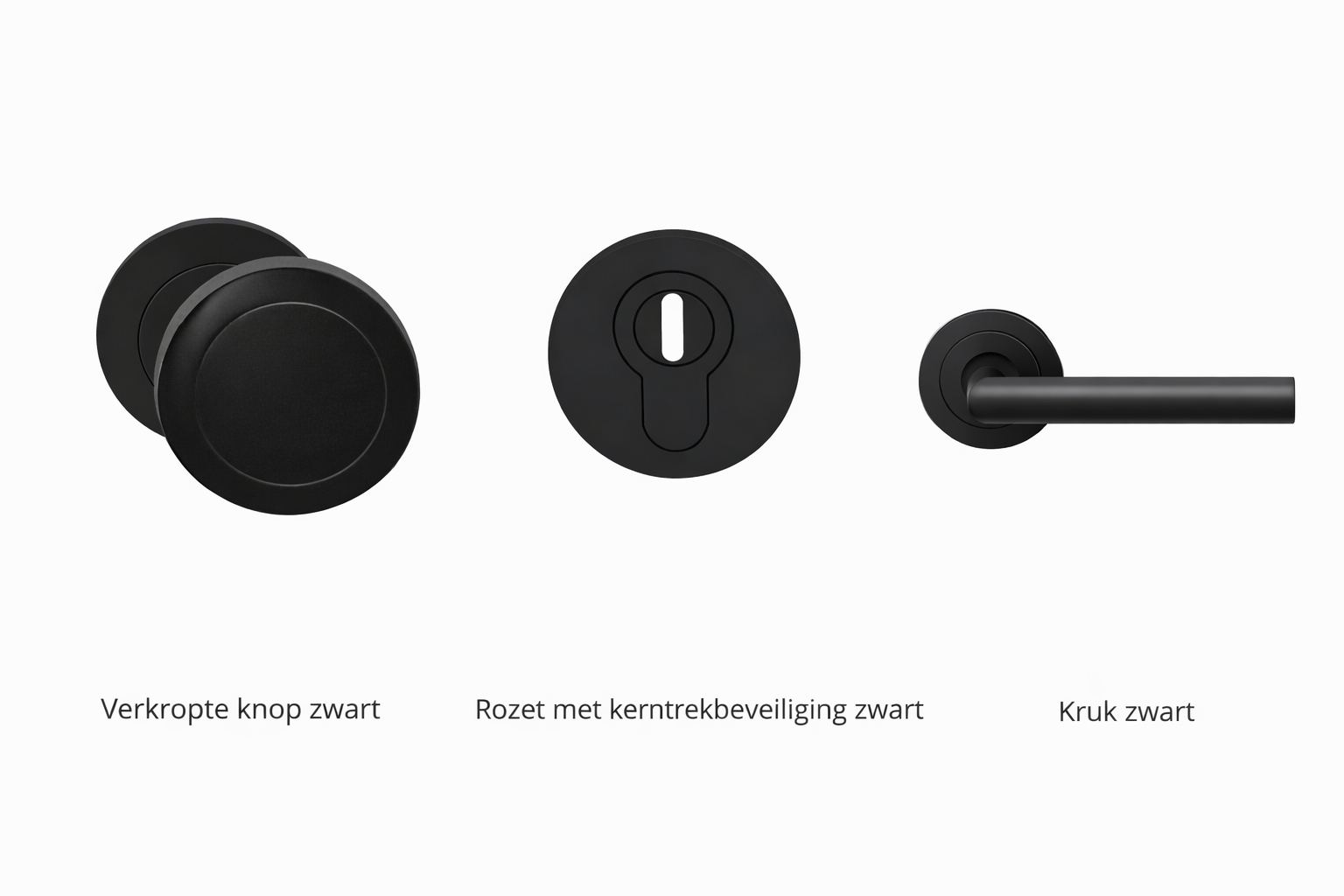 De luxe houten voordeuren woorden voorzien van een knop-kruk bediening. Aan de buitenzijde bevindt zich een verkropte knop met daar onder een rozet met kerntrekking, aan de binnenzijde van de deur zit een kruk en rozet. Bij het samenstellen van de voordeuren kun je kiezen uit de kleuren RVS en Zwart (RAL 9005).
